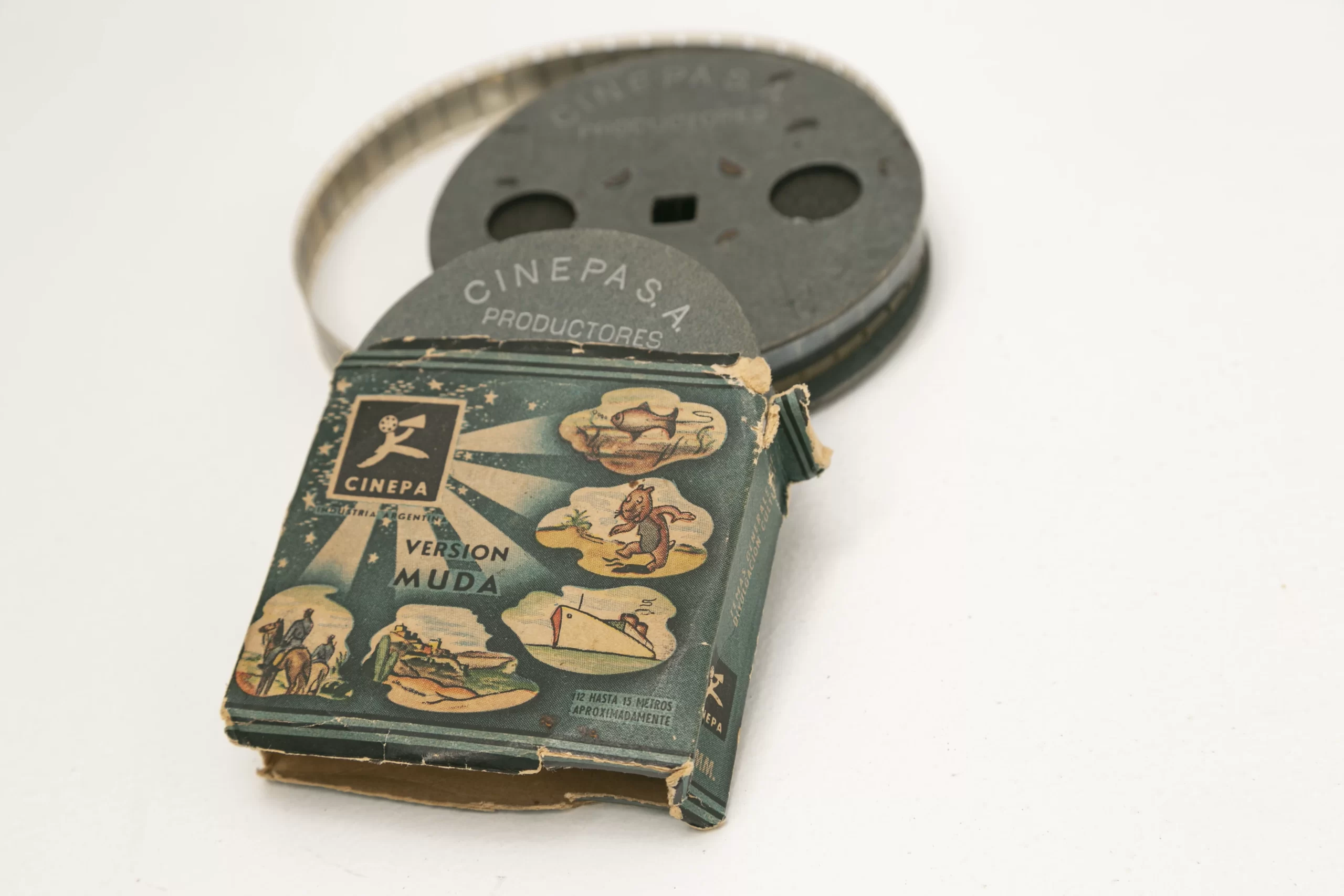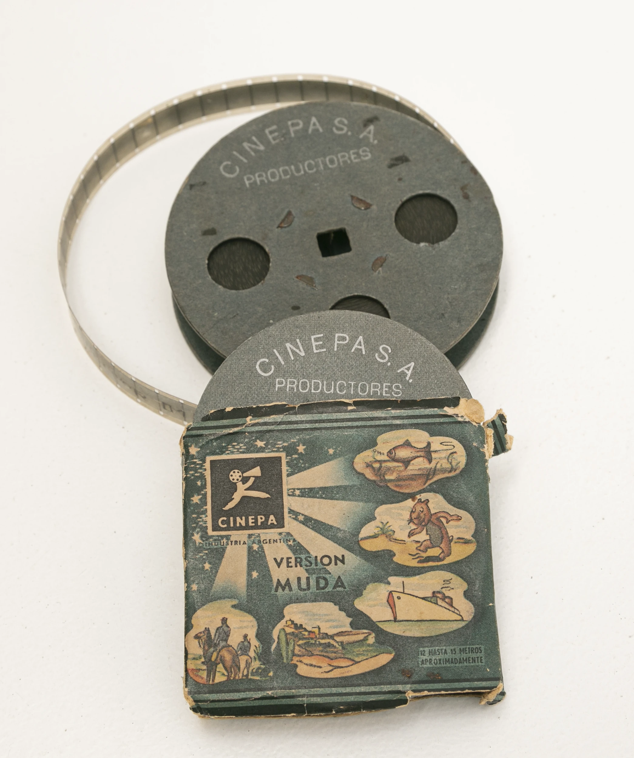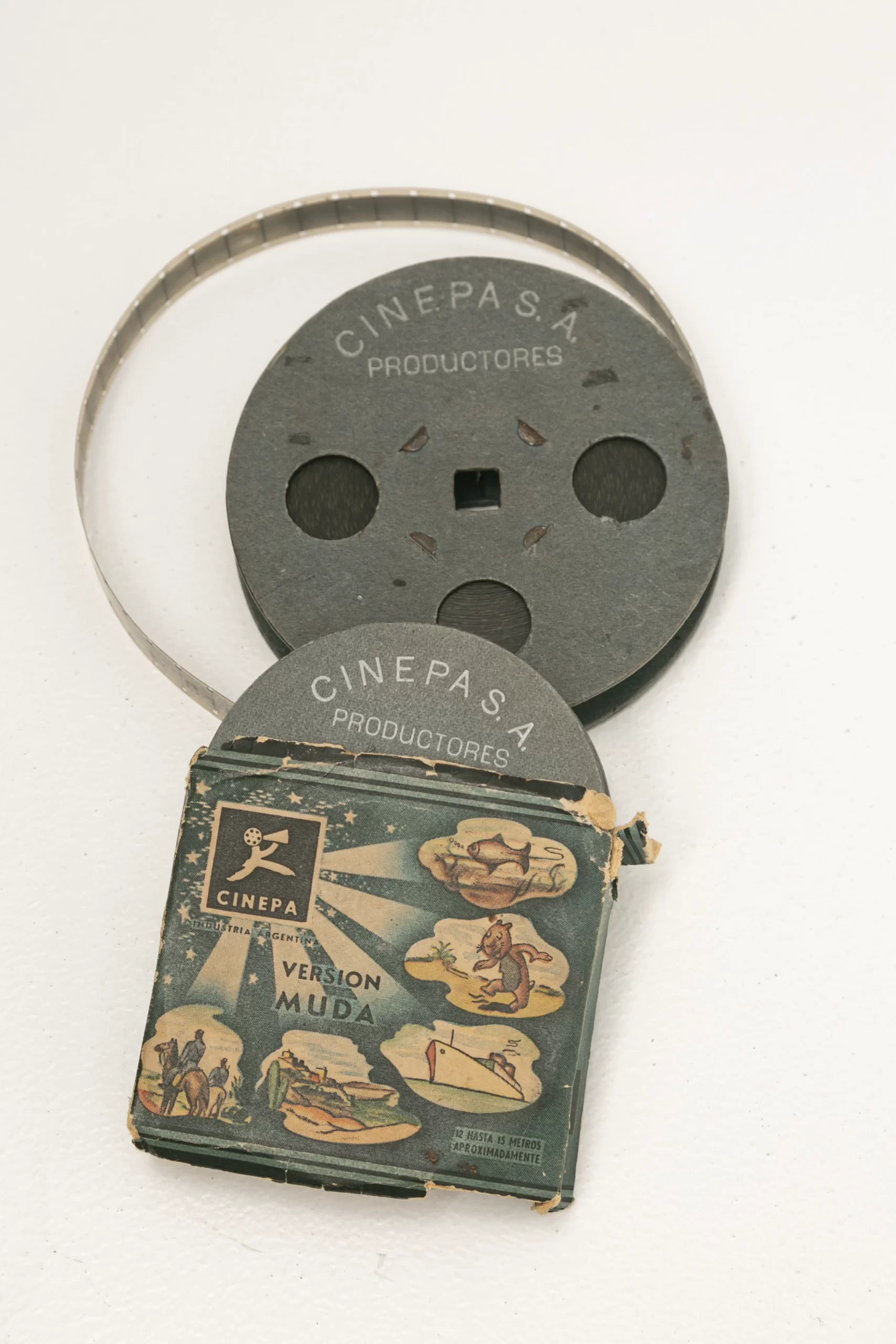 Una pequeña caja de cartón (8 x 8 x 2 cm) impresa en azul y negro. Los dibujos que la decoran prometen viajes, aventuras, maravillas del mundo natural y el encuentro con personajes animados. Antes de la televisión, cuando ir al cine era una actividad masiva a la que la población acudía más de una vez por semana, hubo una manera de llevar esos mundos a los hogares. Los proyectores de películas de 16 milímetros fueron, después de la Segunda Guerra Mundial, el vehículo para acceder a ese misterio: el cine en casa.