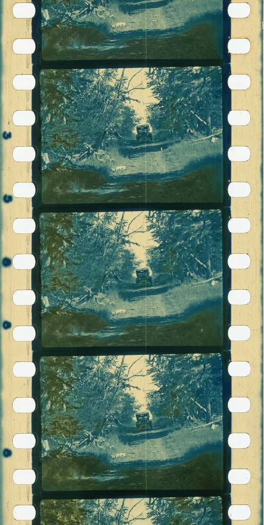 Una tira de película de 35mm con tres fotogramas. En ellos, un auto avanza en dirección a cámara. Se abre paso levantando polvo a través de un bosque azulado que bien podría ser el paisaje encantado de alguna leyenda. Es un fragmento de un film en nitrato de las primeras décadas del cine argentino y, como muchas de las producciones del período, está impregnado de una cualidad extraña que se debate entre lo primitivo y lo eterno. Es como si en muchas de esas imágenes hubiera una belleza que no tiene que ver exclusivamente con lo filmado, sino con el hecho de que en cada plano parece asomarse todo lo que el cine llegaría a ser décadas más tarde y también, en los casos más movilizadores, lo que jamás fue.