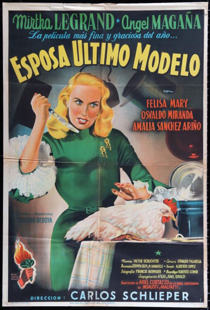 Para la campaña de Esposa último modelo se diseñaron tres afiches con estilos muy distintos, todos ilustrando la escena en la que el personaje interpretado por Mirtha Legrand intenta sin éxito atrapar un pollo para cocinarlo. La imagen del primero es una caricatura del dúo protagónico creada por Mario Paciarotti, alejado ya de algunos de sus primeros trabajos realistas como el afiche de Cita en la frontera, de Mario Soffici. Las caricaturas de actores y actrices empezaron a utilizarse localmente en afiches de cine a inicios de los cuarenta y apenas unos años después, tras la aparición de la revista Rico Tipo y la popularización de muchos caricaturistas que trabajaban en medios gráficos, el recurso se había transformado casi en un sinónimo del género humorístico, por lo que el afiche de Paciarotti probablemente haya sido en aquel entonces el más efectivo para transmitir el tono de la película. El estilo gráfico del segundo afiche (de autor desconocido) está en el extremo opuesto: el registro realista y la imagen de Mirtha Legrand cuchillo en mano podrían haber confundido a potenciales espectadores sobre el género de la película si el mismo no tuviera la frase “La película más fina y graciosa del año”. El tercero, cuya imagen acompaña a este texto, fue ilustrado por Río y funciona como un híbrido de los dos primeros, con un dibujo a medio camino entre la caricatura y el realismo.