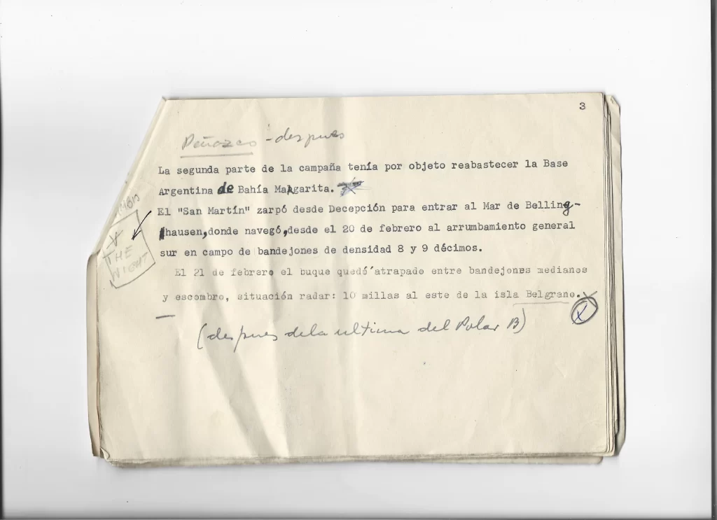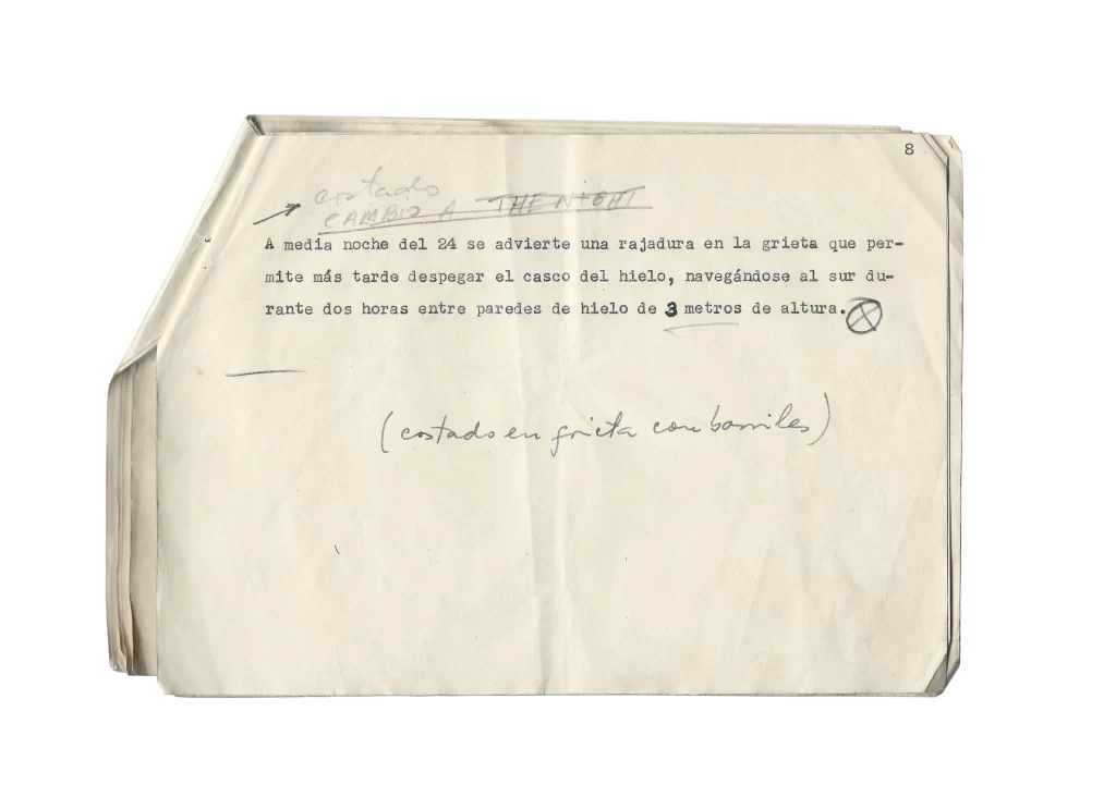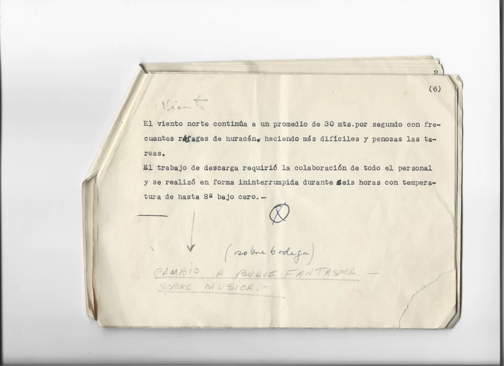 A partir del material en 16mm, la División Radio Cinematográfica perteneciente a la Secretaría de Marina realizó un cortometraje que llamó descriptivamente: Fenómeno glaciológico atrapa al San Martín – Campaña 1959-60. El Museo del Cine guarda una gran cantidad de películas antárticas y, en la mayoría de los casos, dentro de las latas hemos encontrado información importante: datos de colorimetría, títulos posibles o alternativos, etiquetas de laboratorios, notas del director al editor o indicaciones sobre el revelado, etc. Pero en ocasiones el hallazgo resulta excepcional como es el caso de este pequeño y fascinante film: dentro del envase que contenía la película se halló una especie de guion o tratamiento escrito a máquina, lleno de anotaciones y correcciones manuscritas en los bordes realizadas con lápiz. Este material resultó de gran valor para comprender el armado de la versión final y poder completar el relato acerca de una de las aventuras antárticas más notables y menos conocidas del período.