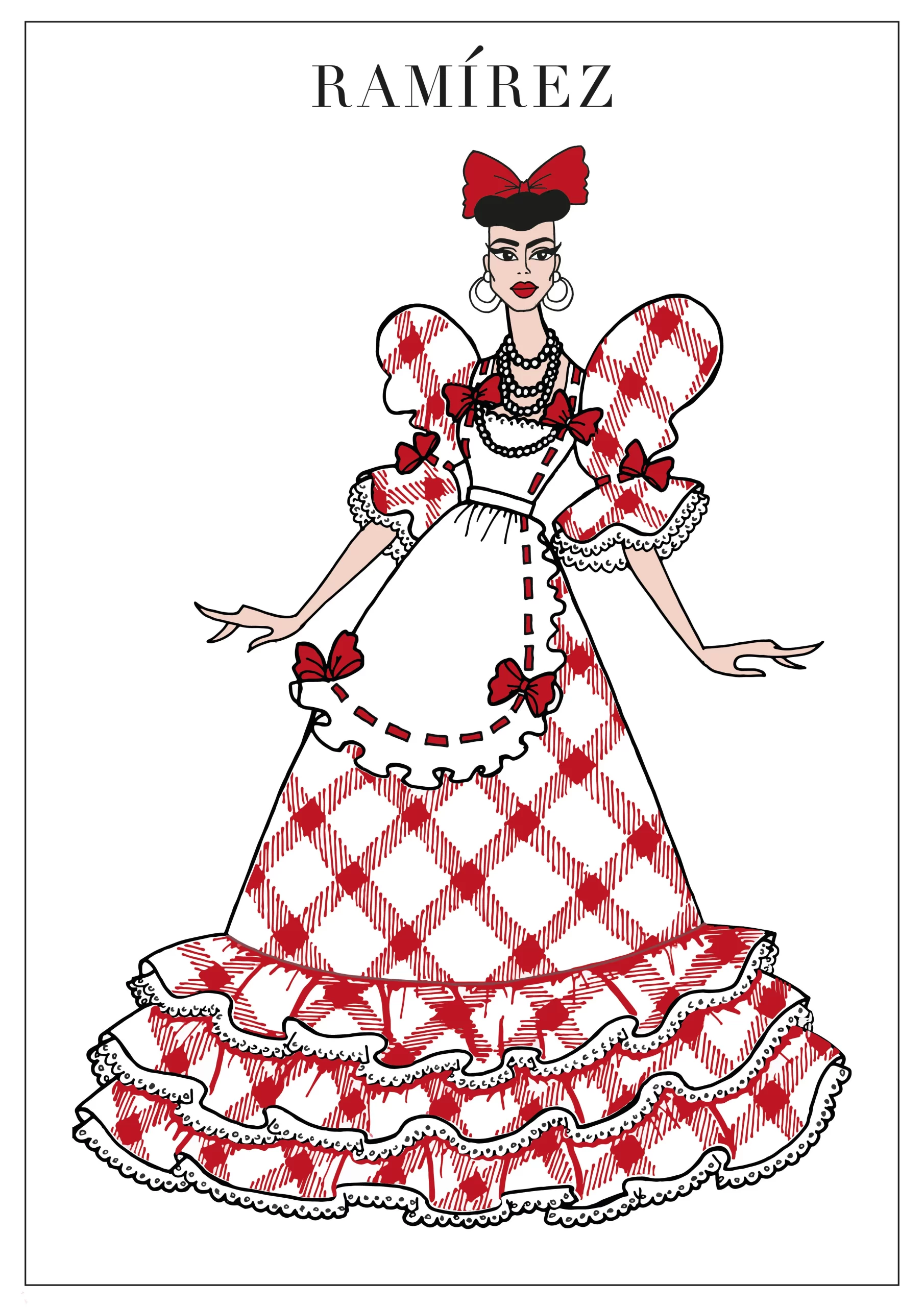 Así que decidí ver el film y, al hacerlo, descubrí con sorpresa que es la estilización de un traje de paisana. ¡Nada más lejano a lo que había pensado inicialmente!Por eso me tentó la idea de hacer mi propia ilustración, pensando en una paisana vista por los ojos de los grandes estudios de cine, que inevitablemente remiten al imaginario de Hollywood y a todo su star-system.